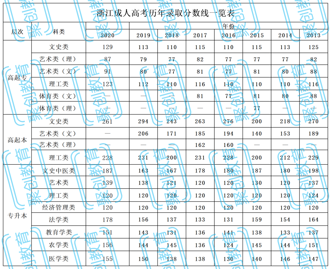 浙江省2020年分数线比较于2019年,整体上是均有10-20分左右的提高,其中,专升本层次的理工类与经济管理类比较稳定,多年一直保持同一分数线。